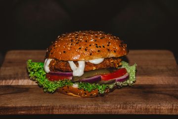 mit 160g Patty aus Süßkartoffeln, Kichererbsen, Kidneybohnen, Koriander und Kreuzkümmel, umhüllt von einer Reisflocken-Panade und Curry-Mango-Chutney